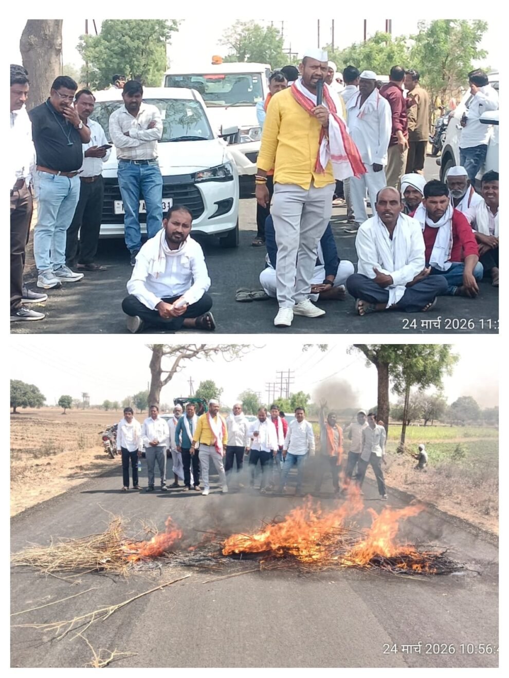 विविध मागण्यासाठी शेतकऱ्यांनी टायर जाळत कनेरगाव- जिंतूर रस्ता अडवला